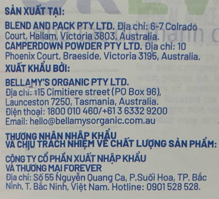 - Nhà xuất khẩu: Bellamy's Organic PTY Ltd.
