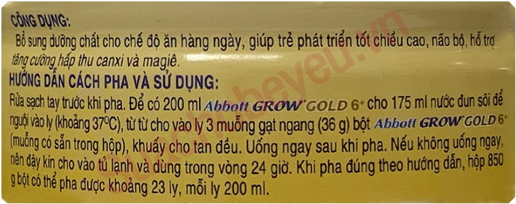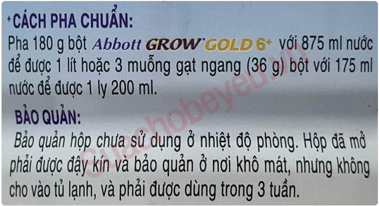 - Rửa sạch tay trước khi pha. Để có 200ml Abbott Grow Gold 6+ cho 175ml nước đun sôi để nguội vào ly (Khoảng 37 độ C), từ từ cho vào ly 3 muỗng gạt ngang (36g) bột Abbott Grow Gold 6+ (muỗng có sẵn trong hộp), khuấy cho tan đều. Uống ngay sau khi pha. Nếu không uống ngay, nên đậy kín cho vào tủ lạnh và dùng trong vòng 24 giờ. Khi pha đúng theo hướng dẫn, hộp 850g bột có thể pha được khoảng 23 ly, mỗi ly 200ml.