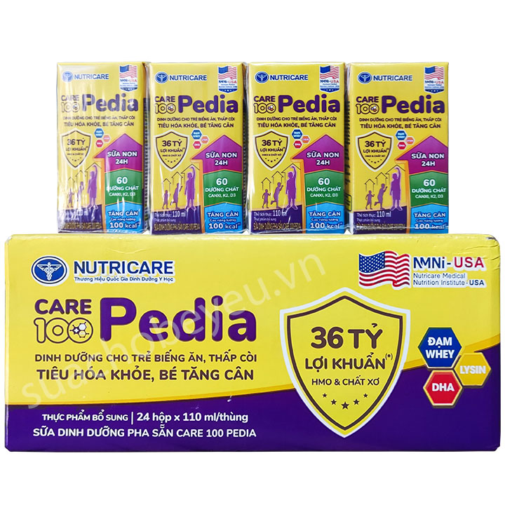Sữa nước Care 100 Pedia còn cung cấp hàm lượng phát triển hệ xương gồm canxi, photpho, vitamin D3 giúp đánh bay thấp còi, bé cao lớn, bắt kịp đà tăng trưởng. Các nghiên cứu lâm sàng của Viện Y học Ứng dụng Việt Nam đã chứng minh chỉ sau 4 tháng đồng hành cùng Care 100 Pedia mẹ sẽ bất ngờ khi bé "cán mốc" những chỉ số "ao ước" về cân nặng, chiều cao và tình trạng dinh dưỡng như tăng 1,5 kg và hiệu quả tăng cân tốt hơn 36,4% so với dùng sữa thông thường, tăng 1,5 kg và hiệu quả tăng cân tốt hơn 36,4% so với dùng sữa thông thường.