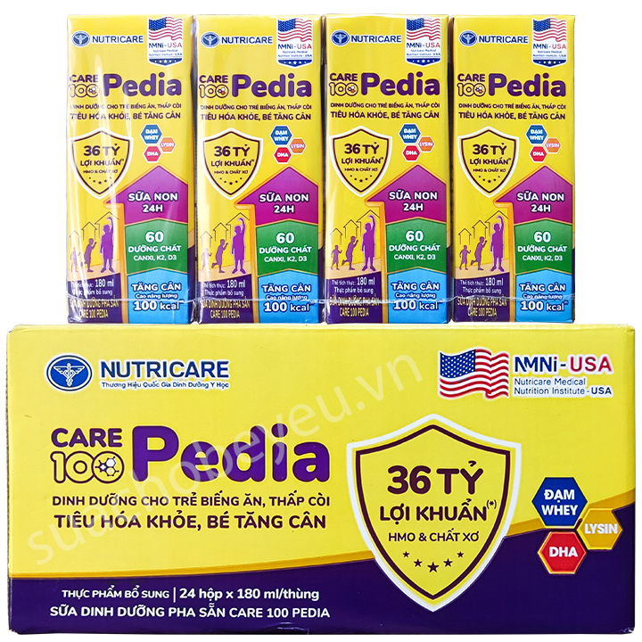 Sữa nước Care 100 Pedia còn cung cấp hàm lượng phát triển hệ xương gồm canxi, photpho, vitamin D3 giúp đánh bay thấp còi, bé cao lớn, bắt kịp đà tăng trưởng. Các nghiên cứu lâm sàng của Viện Y học Ứng dụng Việt Nam đã chứng minh chỉ sau 4 tháng đồng hành cùng Care 100 Pedia mẹ sẽ bất ngờ khi bé "cán mốc" những chỉ số "ao ước" về cân nặng, chiều cao và tình trạng dinh dưỡng như tăng 1,5 kg và hiệu quả tăng cân tốt hơn 36,4% so với dùng sữa thông thường, tăng 1,5 kg và hiệu quả tăng cân tốt hơn 36,4% so với dùng sữa thông thường.
