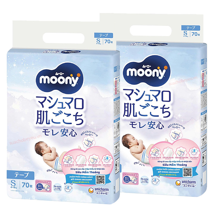 Tã dán Moony Nhật Bản, Size S 70 miếng, cho trẻ 4-8kg. Sự phát triển của bé phụ thuộc vào rất nhiều yếu tố, ngoài chế độ dinh dưỡng, ăn, uống, ngủ, nghỉ thì việc ăn mặc và vệ sinh cho bé là điều cần được các Mẹ quan tâm. Bỉm tã là món đồ mà bất kỳ trẻ sơ sinh nào cũng cần, hiện nay có rất nhiều loại tã bỉm với mẫu mã khác nhau phù hợp với lứa tuổi và giới tính của bé như bỉm dành riêng cho bé trai, bé gái, bỉm cho bé sơ sinh, tập bò và bé đã biết đi. Ở mỗi giai đoạn khác nhau, chất lượng thấm hút sẽ được đặt dày hơn tại những vị trí nhất định.