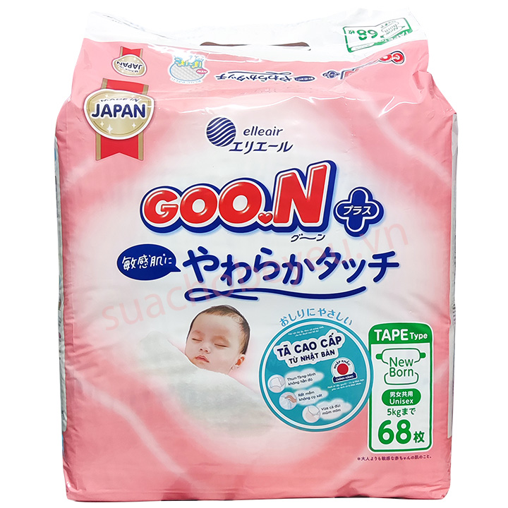 Tã dán sơ sinh Newborn 66 miếng, trẻ < 5kg. Lần đầu tiên ôm ấp thiên thần bé nhỏ trong vòng tay, mẹ đã tin rằng làm mẹ thực sự là một điều vĩ đại. Mẹ luôn tự nhủ mình có thể làm được tất cả vì con. Mẹ lo cho con từng bữa ăn, giấc ngủ, chăm sóc và bảo vệ làn da mỏng manh non nớt của con. Và mẹ an tâm lựa chọn tã giấy GOON cho thiên thần của mẹ. Tã giấy GOON mềm mại thấm hút tốt sẽ chăm sóc cho giấc ngủ của con được trọn vẹn. Có GOON cùng đồng hành, hành trang làm mẹ chắc chắn sẽ nhẹ nhàng hơn.