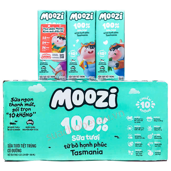 Sữa tươi tiệt trùng Moozi 100% nhập khẩu nguyên hộp từ Tasmania, Úc - Đây là dòng sữa tươi tiên phong tại Việt Nam ứng dụng bộ tiêu chí “10 KHÔNG” trong chăn nuôi bò và sản xuất sữa, mở đầu cho chuẩn mực sữa tươi ưu việt, thơm mát và khác biệt từ thiên nhiên.